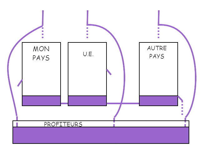 En réalité, l'arrosage détourné et les vases troués consciencieusement se déversent dans l'océan des profiteurs. Les deux vases arrêtent de se vider au niveau du trou le plus bas. Ce trou bas correspond au minimum vital du pays le plus pauvre.