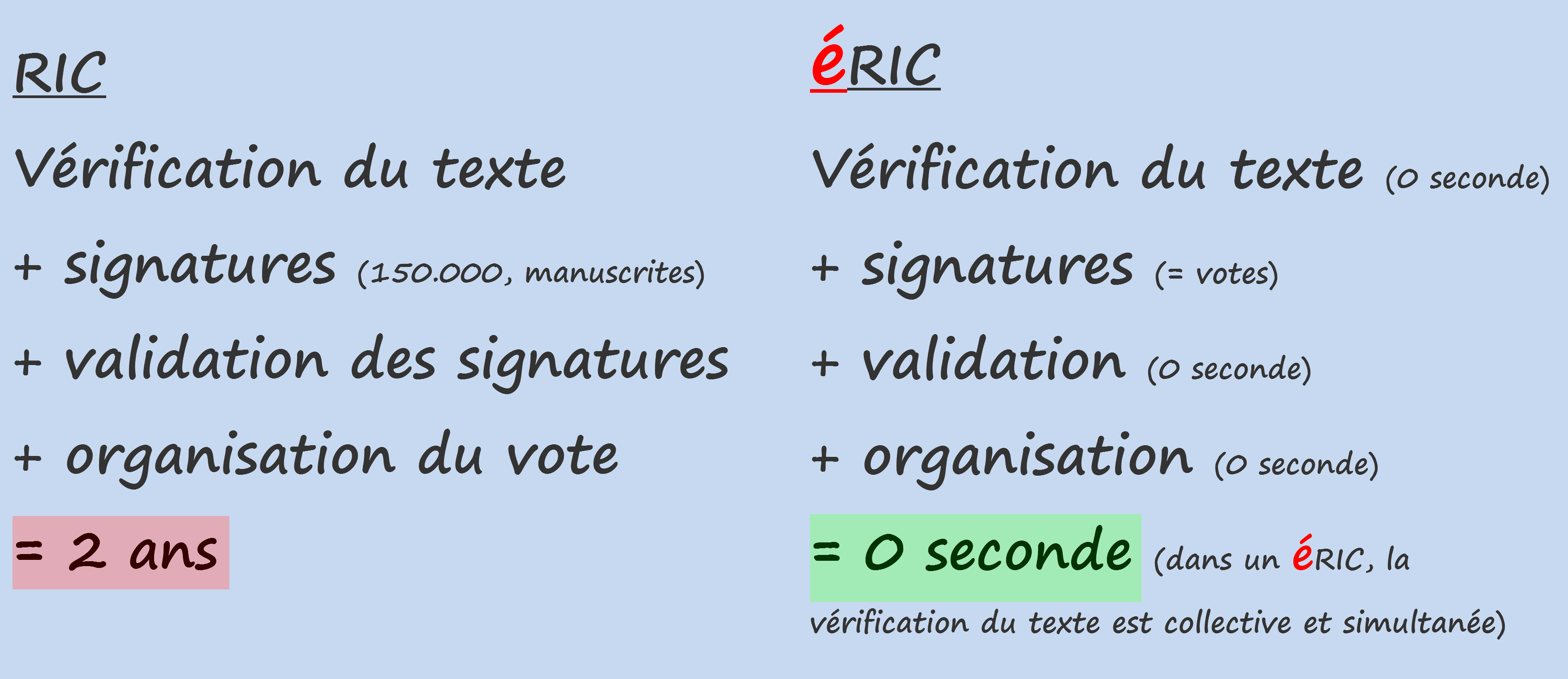 1) Un éRIC est une pétition par internet qui devient une loi, ou un règlement, dès qu'elle est signée par la majorité réelle des citoyens concernés.